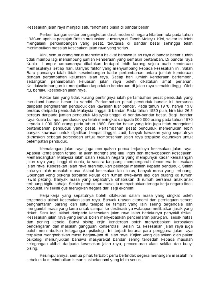 Karangan Kesesakan Jalan Raya / Kesesakan lalu lintas akibat kemalangan.. Spm > bahasa melayu > karangan contoh bm kertas 1. Informasi tentang contoh karangan, karangan adalah sebuah karya tulis yang berbentuk prosa naratif fiktif. Hal ini demikian kerana kemalangan jalan raya akan menyebabkan kesesakan lalu lintas. Kesesakan lalu lintas di kuala lumpur : Kita tahu bahaya yang berkaitan dengan jalan berlubang kerana satu panggilan telefon boleh membantu mewujudkan keadaan lebih selamat bagi kesemua pengguna jalan raya.
